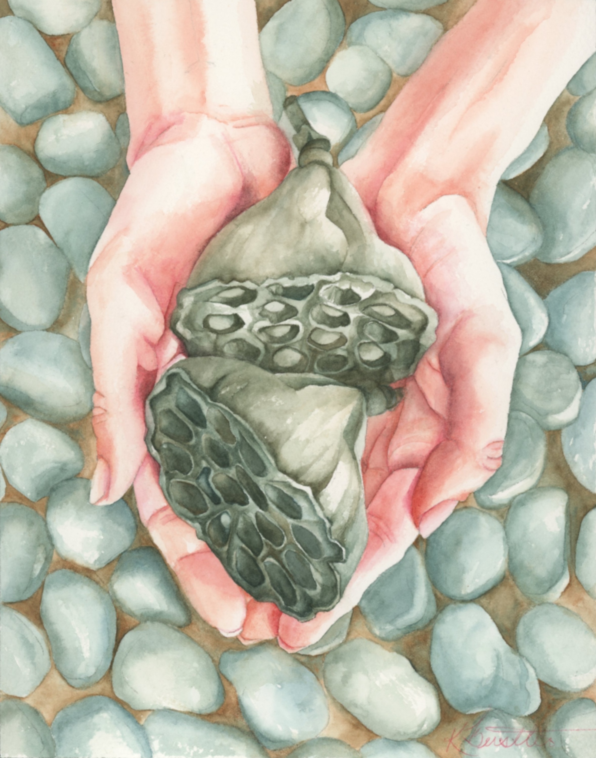 ``Rest II`` Collection: Hands Year Created: 2022 Two lotus seed pods cradled by two hands held over small river rocks. Shop on Etsy Share this post Share on FacebookShare on Facebook Share on XShare on X Pin itShare on Pinterest Share on LinkedInShare on LinkedIn Share on WhatsAppShare on WhatsApp Project navigationPreviousPrevious project:Confronting the ShiftNextNext project:Courage